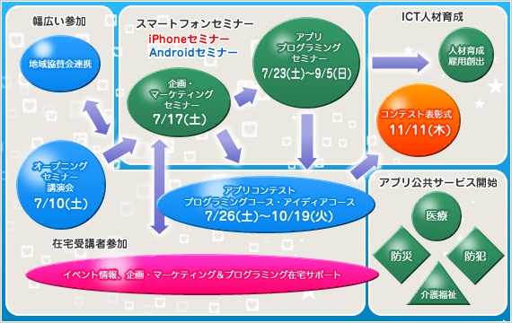 7/10のフォーラムの内容、7/16の企画・マーケティングセミナー、7/23から実施されるスマートフォンアプリプログラミングセミナーにおいては、より詳しい内容、情報を本サイトにてお届けします。
